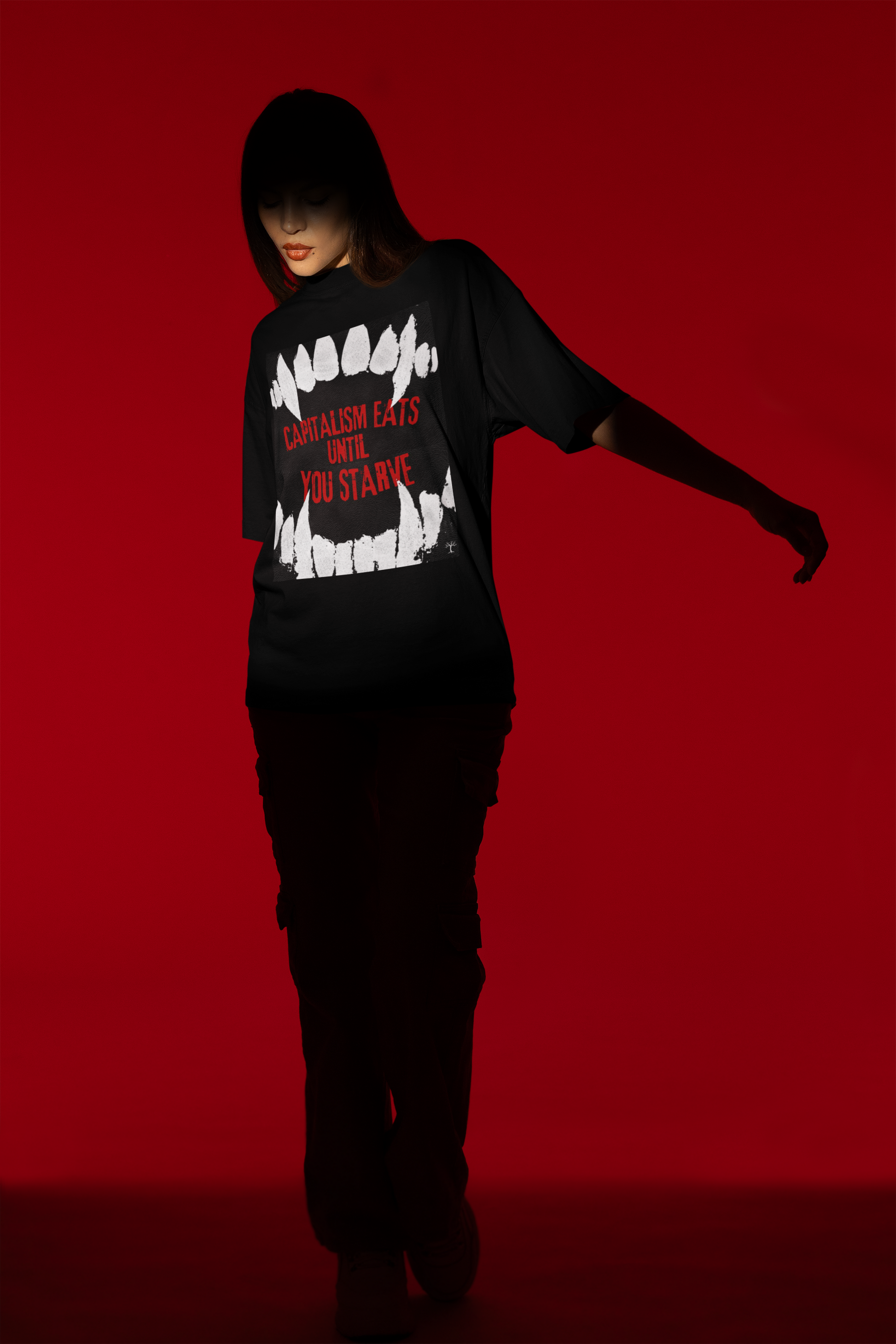 • Bold Statement Graphic – “Capitalism Eats Until We Starve” printed loud and unapologetic.